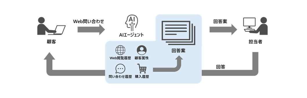 - 現場の業務フローや課題を可視化の結果、Webからの問い合わせ対応において「顧客情報の分散」「提案の属人化」「アップセル・クロスセル機会の見逃し」という課題が明らかになりました。具体的には、顧客属性や過去の購入履歴、問い合わせ履歴、Web閲覧履歴といった情報が複数システムに分散しており、担当者が迅速かつ最適な回答や提案を行うことが困難。
