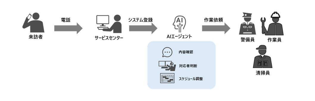 - AIによる自動化・支援が効果的な領域を抽出し、適用業務を選定。サービスセンターまたはサポートデスクが一次受けした内容を確認し、関係者のスケジュール調整後および作業を依頼するプロセスをAIエージェントの対応範囲とし、業務効率を向上。