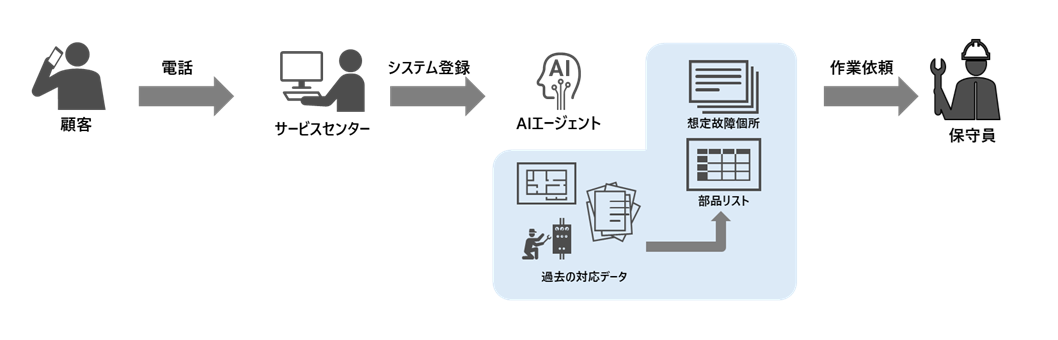 - 現場の保守対応業務をヒアリングした結果、「故障箇所の特定に時間がかかる」「必要部品の不足による再訪問が発生する」という課題が明らかとなる。保守員は現場到着後に過去事例を確認しながら故障箇所を推測し、部品を手配するため、対応時間が長引くケースが散見。