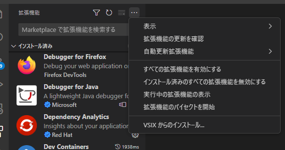 ダウンロードしたらVSCodeの左側アクティビティバーで拡張機能を選択後、サイドバー上部の「・・・」から「VSIXからのインストール...」をクリックするとファイル選択画面が出てくるので、先ほどダウンロードしたeditor-for-sbom-0.0.1.vsixを選択してインストールします。
