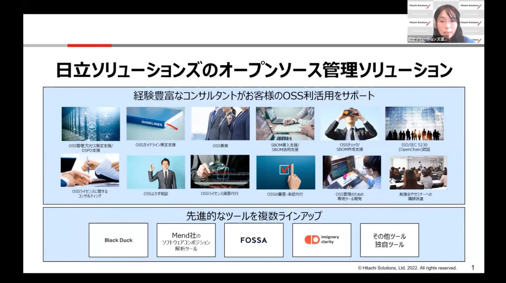 それでは、少しだけご紹介をさせてください。日立ソリューションズのオープンソース管理ソリューションは、経験豊富なコンサルタントがお客さまのOSSの利活用をサポートするコンサルティングサービスと、先進的なOSS、SBOMツールからなるソリューションです。