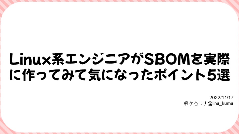 熊ケ谷:今回の本題ですね。SBOMについてということで、今回私はLinuxに関してサーバー寄りの立場で参加しています。SBOMというと、どちらかというと今は組み込みとか製造業系で活発に議論がされているのかなという印象を持っているんですけども、今回私はいわゆるITシステム、サービス、サーバー寄り、エンドユーザー寄りのポジションで、SBOMを使ってみた感想をお話ししたいと思っています。