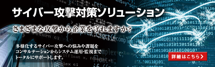 サイバー攻撃対策ソリューションは、高度化する標的型攻撃、マルウェア、DDoS攻撃に加え、リスト型攻撃、オンライン不正送金などに対応する最適なサイバー攻撃対策をコンサルテーションからシステム運用・監視までトータルに提供します。