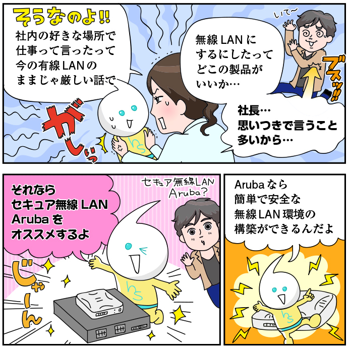 日立ソリューションズが提供するセキュア無線LANシステムArubaは、このような企業内無線LAN構築に適した機能、性能を持ち、企業の働き方改革を、ネットワークインフラからサポートします。