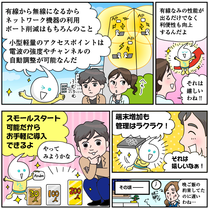 Arubaのコントローラがアクセスポイント管理、暗号復号処理、認証に基づくアクセス制御をすることにより、建屋内/外、分散拠点、出張先などどこでも変わらないユーザモビリティを提供し、さらに運用コストも削減する無線LANのリーディング製品です。
