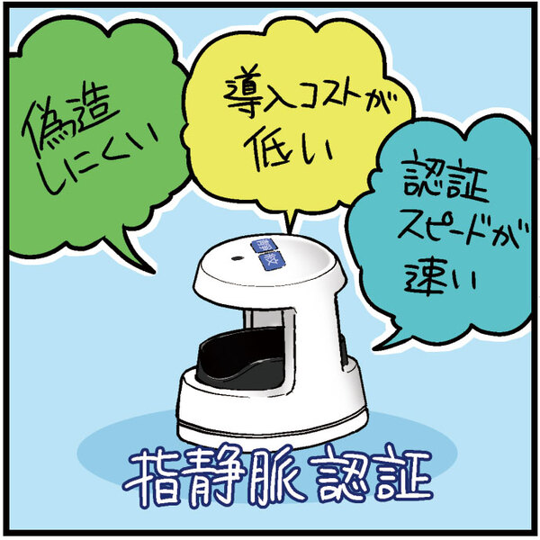 これに対して、指静脈を使った認証の場合、外部からは見えない指内部にある静脈を利用して認証するため、偽造・改ざんが困難です。また、シンプルな認証装置のため比較的低コストで導入可能です。さらに、指1本かざすだけの簡単な操作でスピーディーに認証ができるというメリットもあります。