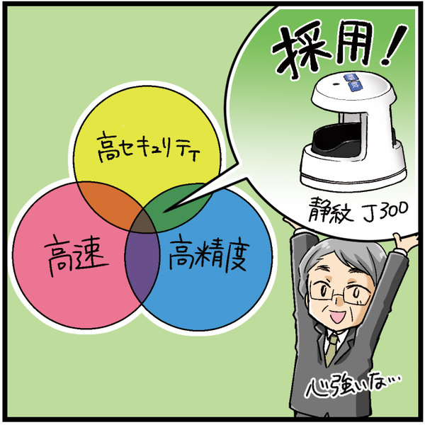 そこで、注目を浴びているのが指内部の「静脈のパターン」を使って認証を行う、日立ソリューションズの指静脈認証システム「静紋 J300」です。「静紋 J300」は、あらかじめ登録しておいた指静脈のパターンを使って、高精度かつ高速に認証を行うことができます。