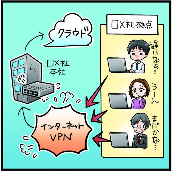 メリットの多いクラウドサービスですが、その普及によって既存のネットワークインフラ、特に複数拠点を閉域網やインターネットVPNで結んでいる企業では、ネットワークの速度低下が起こり始めています。その原因は、クラウドサービス利用時に発生するインターネットアクセスのトラフィック増によるものです。