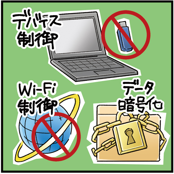 また、PCに接続するUSBメモリーやスマートフォンなどの外部機器や、LAN、Bluetoothなどの通信機能などをPCごとに制御するデバイス制御、あらかじめ許可されたWi-Fiアクセスポイントのみ接続を許可するWi-Fi制御などもあります。