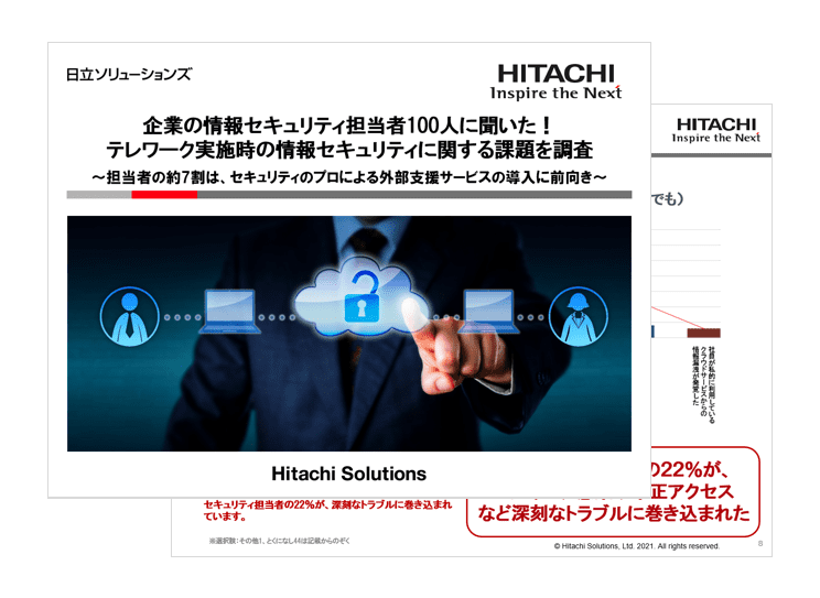 株式会社日立ソリューションズは、「ゼロトラストセキュリティに関する調査」を実施しました。企業に在籍している情報セキュリティ担当者100名を対象に、「ゼロトラストセキュリティの認知度」「ゼロトラストセキュリティという言葉を聞くようになった時期」「リモートワークの導入状況」「正当な利用者かどうか検証(認証)する方法」「検証(認証)の仕組みを導入したきっかけ」「ゼロトラストセキュリティの現状(実施している対策)」「ゼロトラストセキュリティを導入したメリット」「今後のゼロトラストセキュリティ導入予定」「ゼロトラストセキュリティ導入の課題」などをお聞きしました。各種分析結果をまとめた「調査レポート」もダウンロードできます。