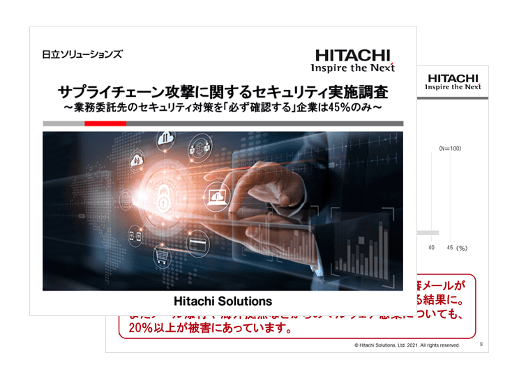株式会社日立ソリューションズは、「サプライチェーン攻撃に関するセキュリティ実施調査」を実施しました。企業に在籍している情報セキュリティ担当者100名を対象に、「サプライチェーン攻撃への対策状況」「業務委託先とのセキュリティ対策のルール設定」「サプライチェーン攻撃の被害状況」「社内で発生したことのあるセキュリティリスク行為」「委託先とのセキュリティ強化のための対策」「サプライチェーン攻撃に対するセキュリティ対策の現状」などをお聞きしました。各種分析結果をまとめた「調査レポート」もダウンロードできます。