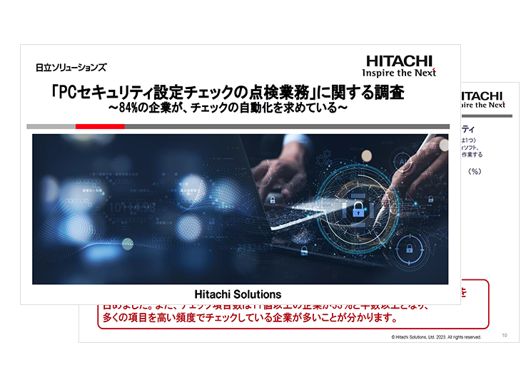 株式会社日立ソリューションズは、「PCセキュリティ設定チェックの点検業務に関する調査」を実施しました。企業に在籍している情報セキュリティ担当者100名を対象に、「従業員のPCセキュリティ設定チェックの実施状況」「従業員のPCセキュリティ設定チェックの内容」「従業員のPCセキュリティ設定チェックの実施頻度や項目数」「従業員のPCセキュリティ設定チェックのためにかけている時間」「従業員のPCセキュリティ設定チェック項目の中で手間がかかっていること」「PCセキュリティ設定チェックは管理者にとってどれくらいの負担があるか」「自動化に対する要望」「過去にPCセキュリティ設定の不備による事故にあったことがあるか」「PCのほかに従業員にセキュリティ設定のチェックをさせているデバイス」などをお聞きしました。各種分析結果をまとめた「調査レポート」もダウンロードできます。