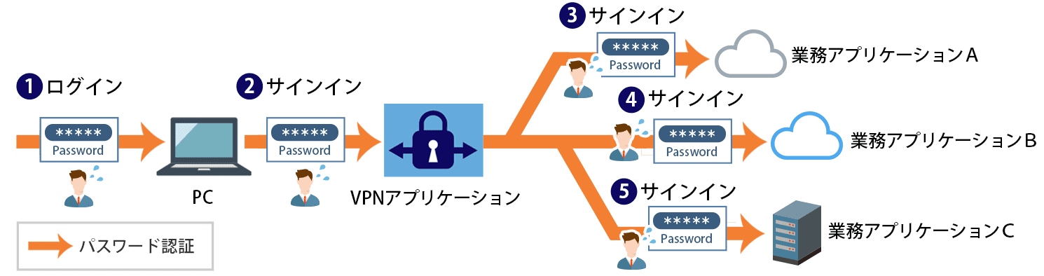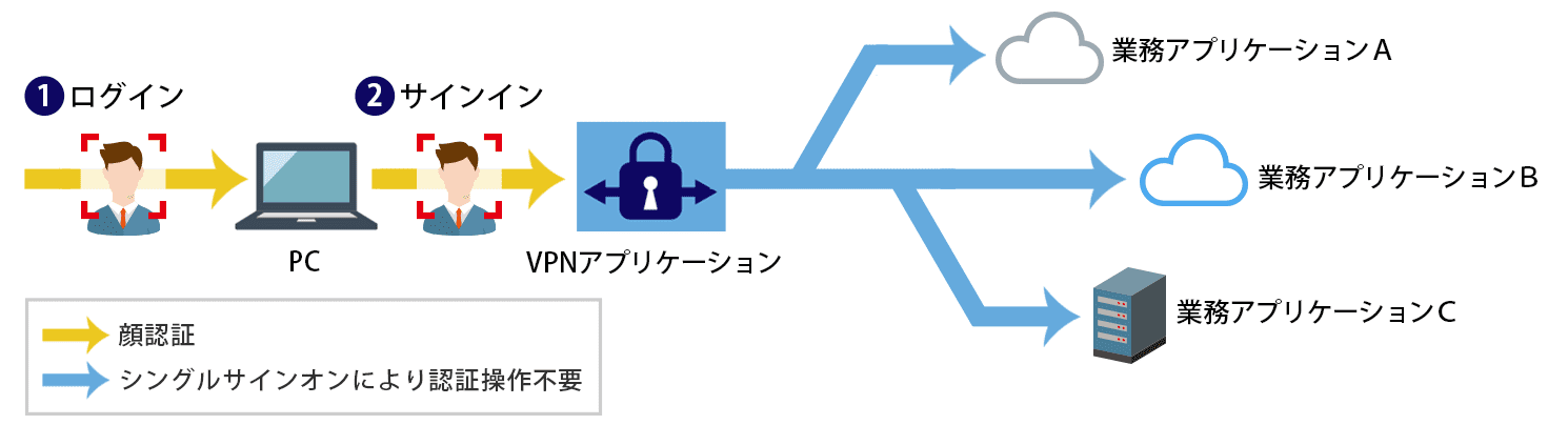 パスワード入力5回が、顔認証2回だけに。業務アプリケーションの数が多ければ多いほど、ユーザー負担の軽減幅が大きくなります。 * VPNアプリケーションや業務アプリケーションがSAML認証が可能かつ、Biometric Signature Sign-in Serviceとの連携が可能であることが前提