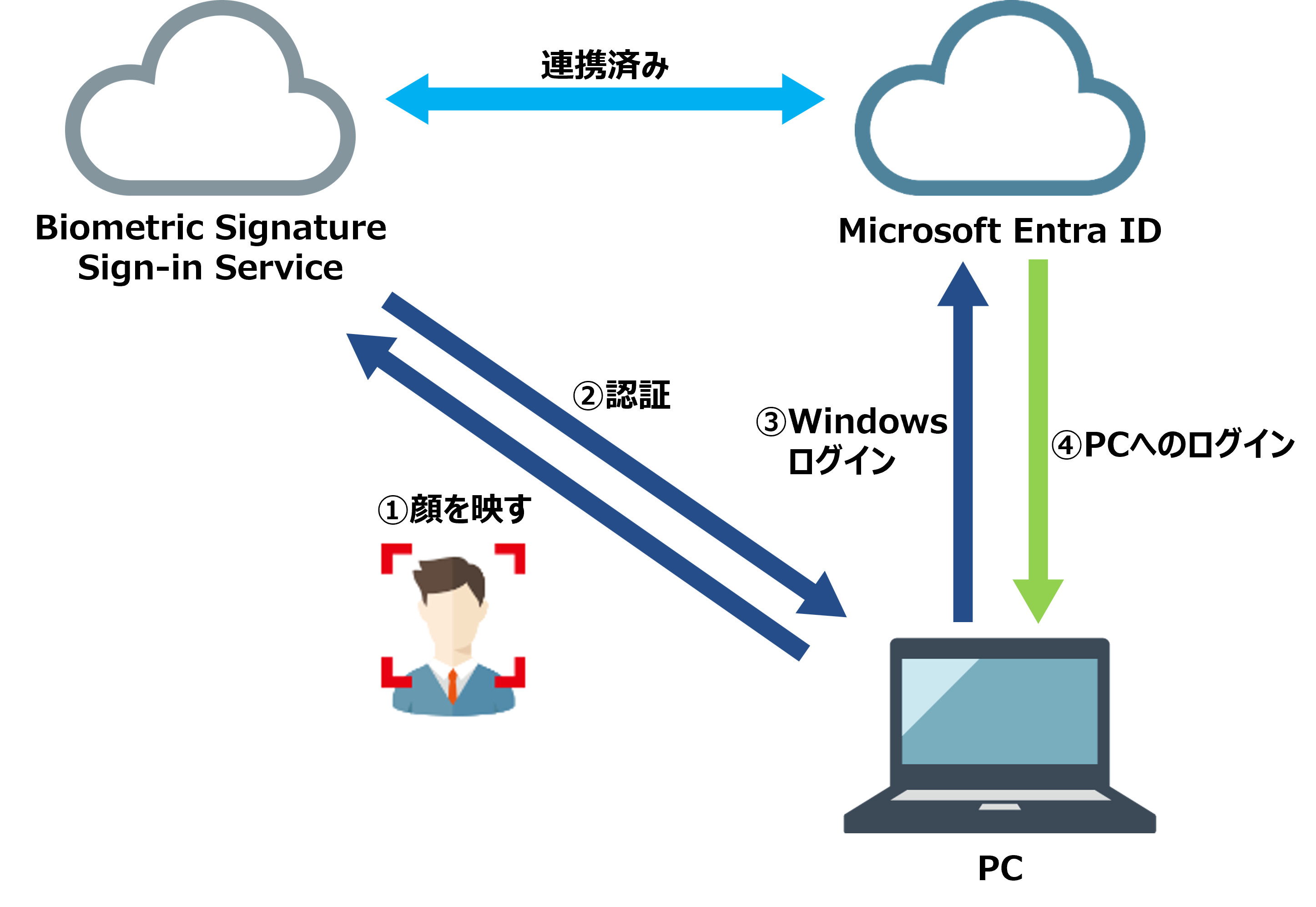従来、Microsoft Entra ID(旧称 Azure Active Directory)と連携してPCへのログインを行う際には、オンプレミスのActive Directoryを利用していることが前提となっていました。Biometric Signature Sign-in Serviceは、Active DirectoryがないWindows環境下でも、顔認証によるPCへのログインや業務アプリケーションへのシングルサインオンを実現します。