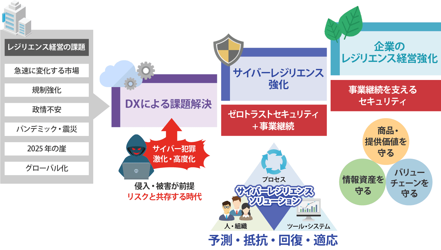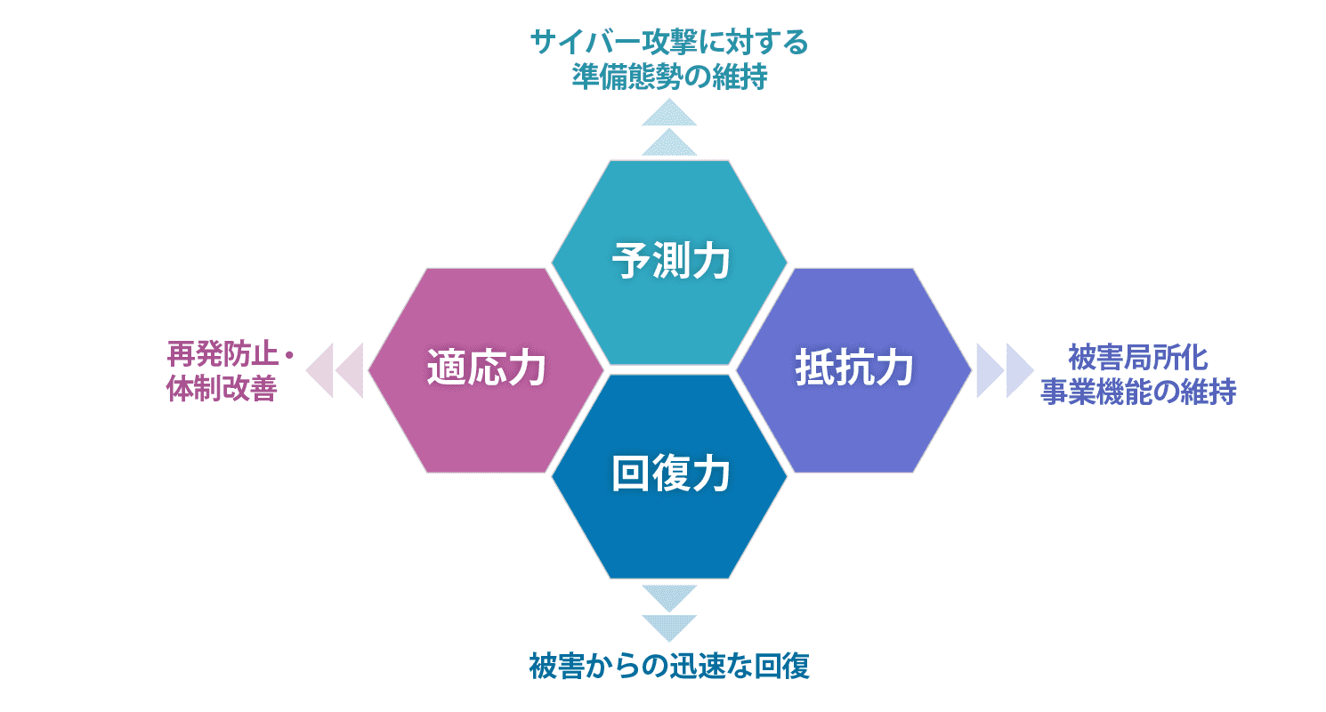 サイバーレジリエンスは、サイバー攻撃の被害が発生しても、抵抗力や回復力を高めることで、事業継続を可能にする取り組みです。