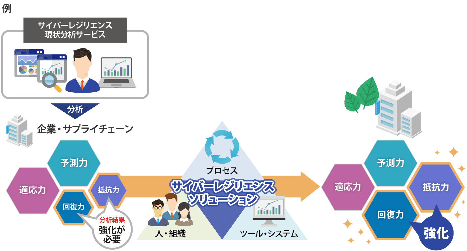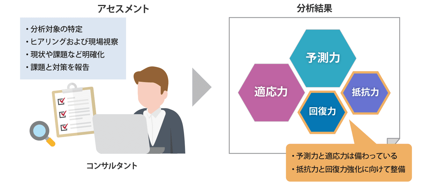 分析結果から、お客さまのサイバーレジリエンスの現状や課題を独自手法によって明確化。セキュリティ強化ポイントを提示