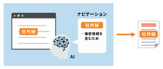 文書の編集中に、AIが段落単位および文書全体をリアルタイムに解析し、「極秘」「社外秘」などの秘密度を自動判定します。判定結果は、その根拠とあわせてユーザーに提示され、ナビゲーションに従うだけで適切な秘密度を設定できます。個人情報だけでなく、戦略資料や設計図などの企業秘密情報も対象とし、文脈にもとづいて機密性を判断します。