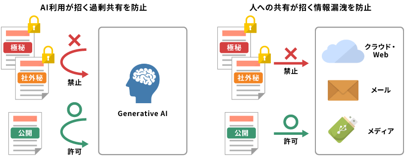 Microsoft PurviewなどのDLP製品との連携により秘密度に応じて情報を保護でき、AI利用が招く過剰共有を防止します。