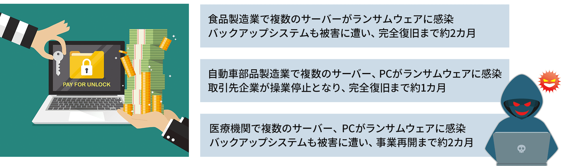 ランサムウェアに感染した場合、端末やサーバーのデータが暗号化され使えなくなってしまうため、場合によっては事業停止といった事態に陥ってしまう可能性があります。復号のために身代金を支払ったとしても、データが必ず復号される保証もありません。バックアップを取得していたとしても、バックアップデータ自体もランサムウェアに感染していたというケースもあります。