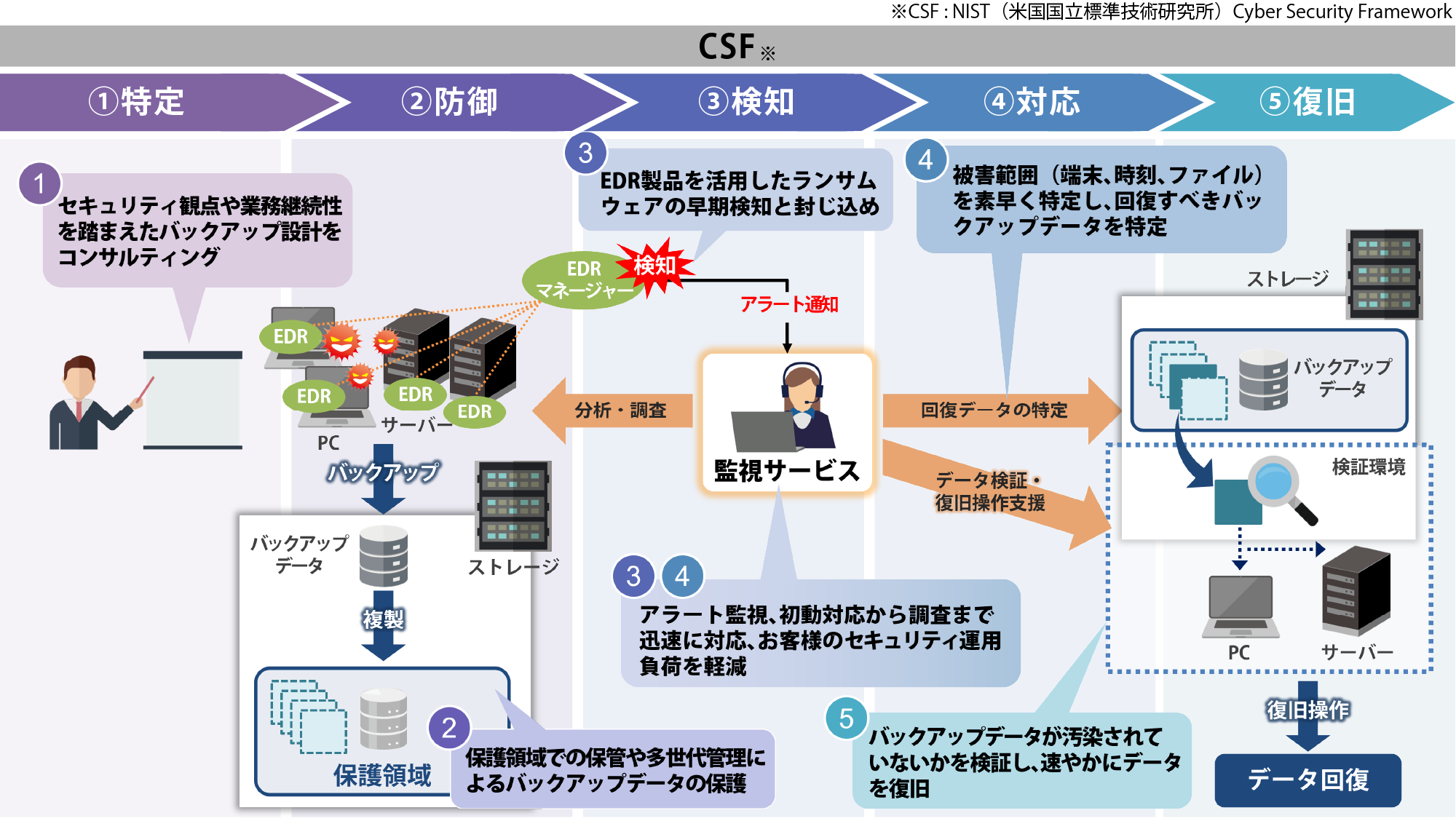 データ回復ソリューションは、豊富な知識を持ったセキュリティエキスパートが、セキュリティの観点や業務継続性を踏まえたバックアップ・リストアの設計から構築、EDR製品を活用した端末の日常的な監視運用、インシデント発生時の初動対応、データ復旧まで支援。お客さまの事業継続に必要な対応をワンストップで提供します。