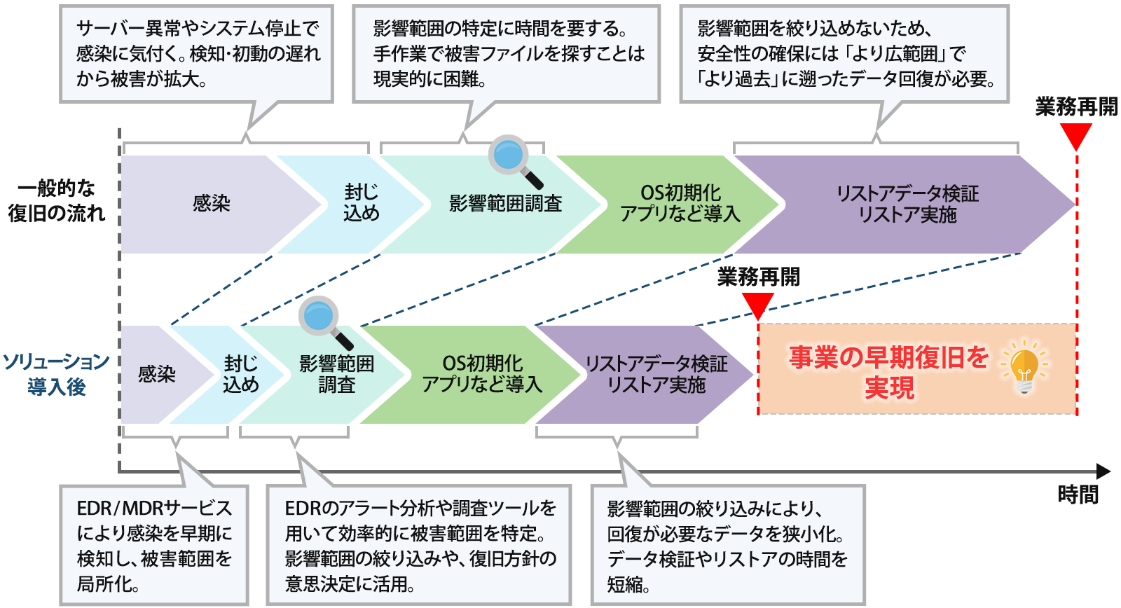 データ回復ソリューションにより、被害範囲(端末・時刻・ファイル)を特定することで、ランサムウェア感染後の「リストアデータの検証」や「リストア実施」の工数を大幅に削減可能。業務の早期再開を支援します。