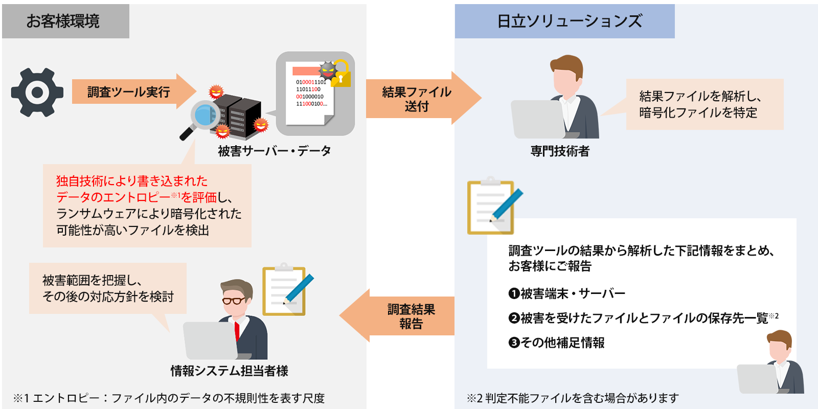 日立ソリューションズの独自技術を活用した調査ツールを用いて被害ファイルを特定。回復が必要なデータを絞り込むことで、事業復旧にかかる時間を削減。