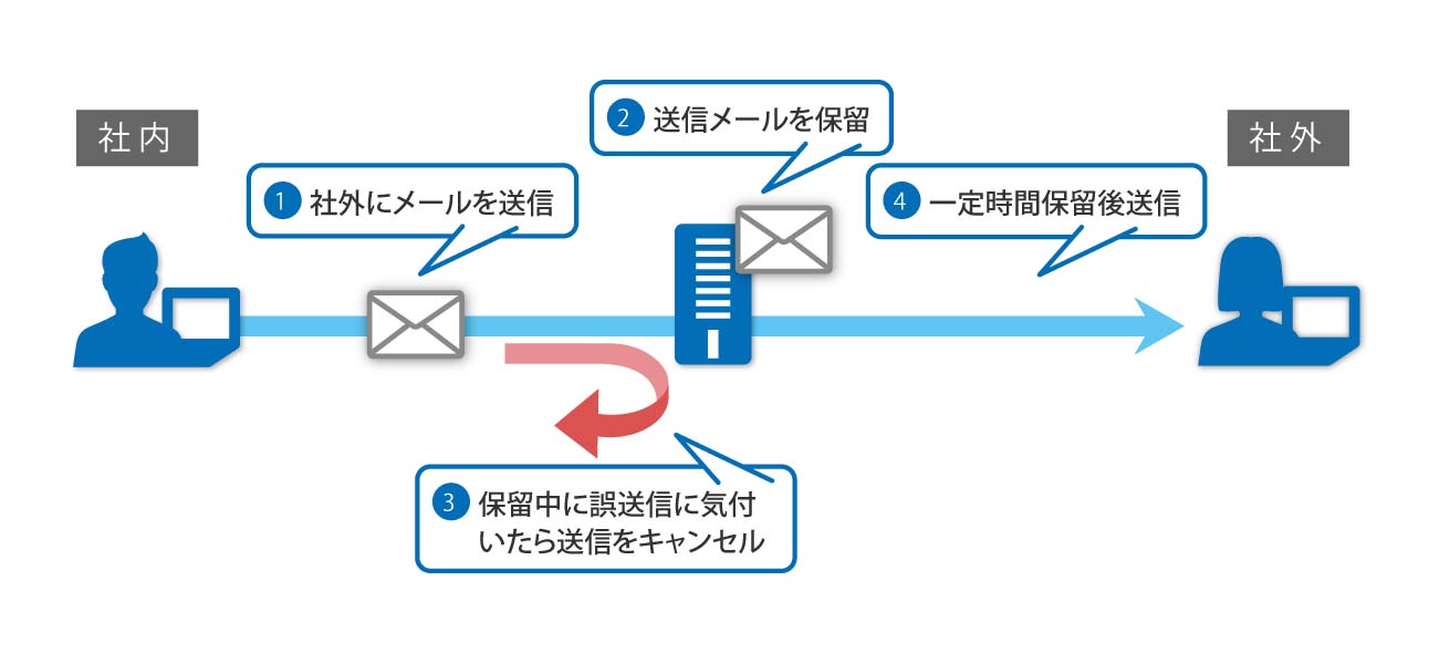 社外あてのメールを一定時間サーバーで保留にすることで、誤送信したメールをキャンセル
