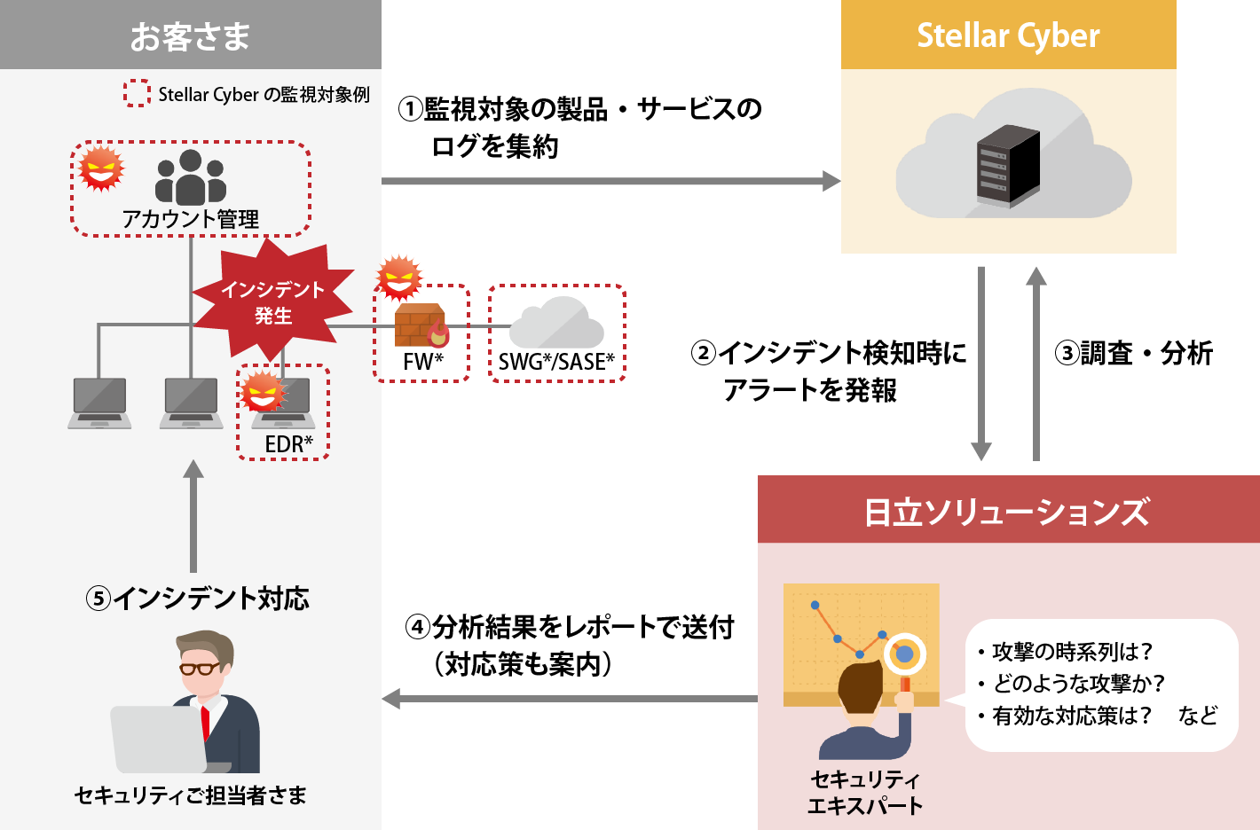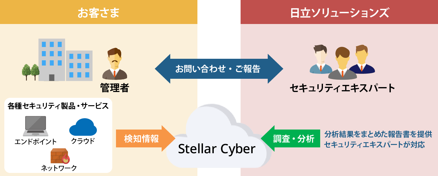 監視対象の製品・サービスからのログをStellar Cyberで収集。Stellar Cyberでインシデントが通知された場合には、インシデントスコアにもとづき、日立ソリューションズのエキスパートがインシデントを分析・報告します。