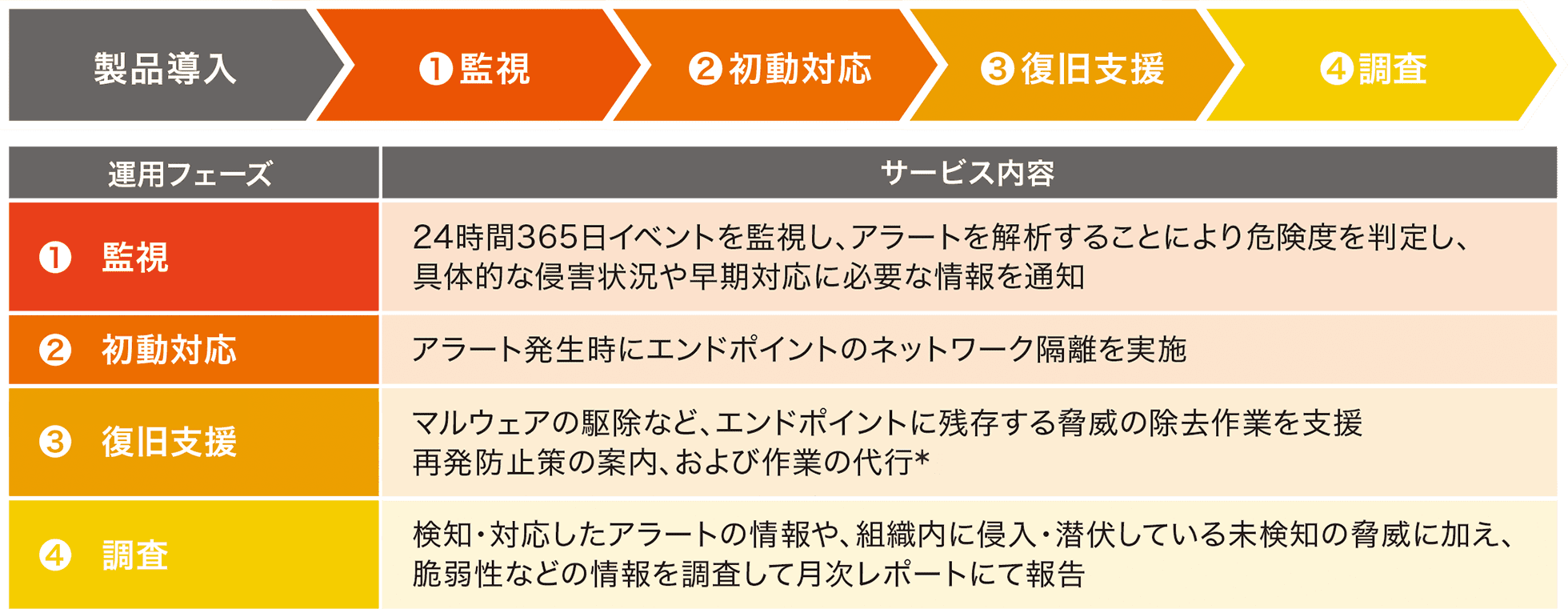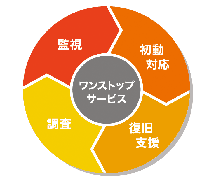 監視、初動対応、復旧支援、調査の4つの運用フェーズに応じたサービスをご提供します。お客さまのご要望にあわせ、必要なサービスを選択いただけます。