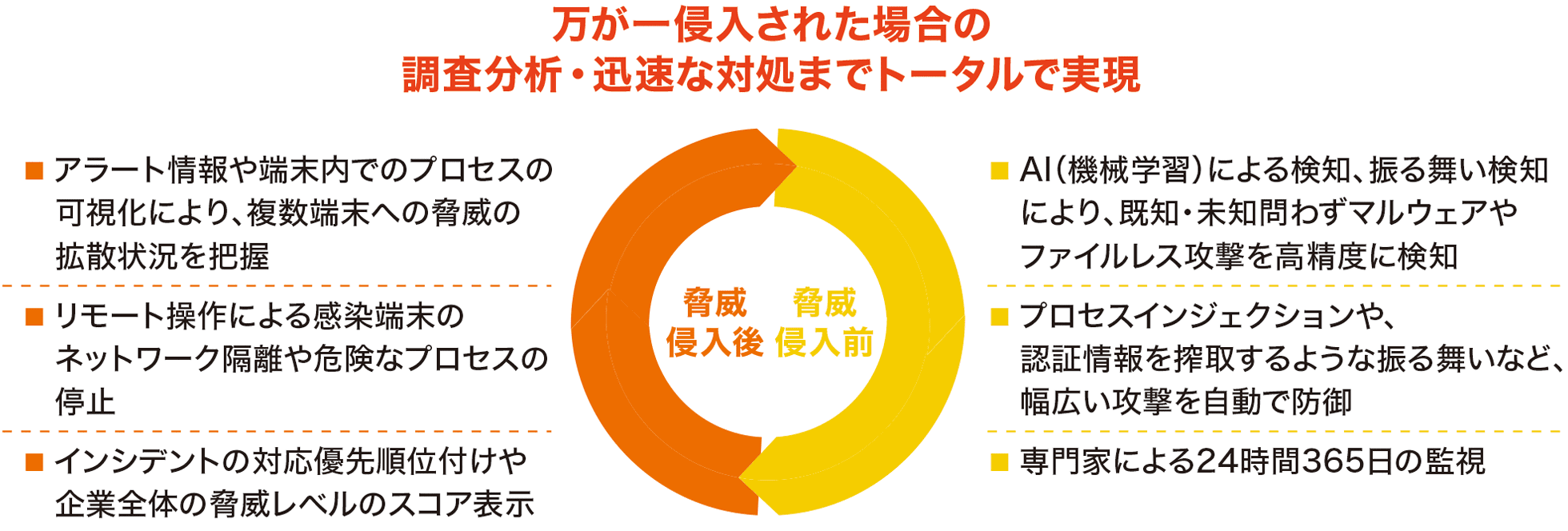 インシデント発生時は、アラート解析により危険度を判定。対応が必要な脅威の場合は封じ込めなどの対処まで実施します。