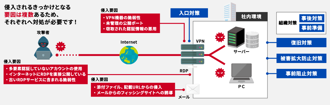 ランサムウェア攻撃は高度化する一方で、侵入経路の傾向は大きく変わっておらず、多要素認証が導入されていないVPN機器やリモートデスクトップなど、運用・設定における不備を狙われることが依然として多い状況です。侵入要因としてどのようなものがあるかを把握し、それぞれに対処することが必要になります。