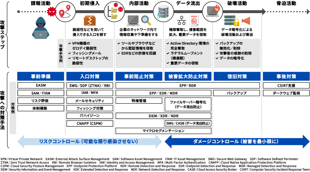 | 初期侵入 | SWG/SDP(ZTNA)/RBI | ゼロトラストによる認証制御と不正Webアクセス制御により脅威の侵入を抑止し、ブラウザーセキュリティにより認証情報の窃取を阻止 | |