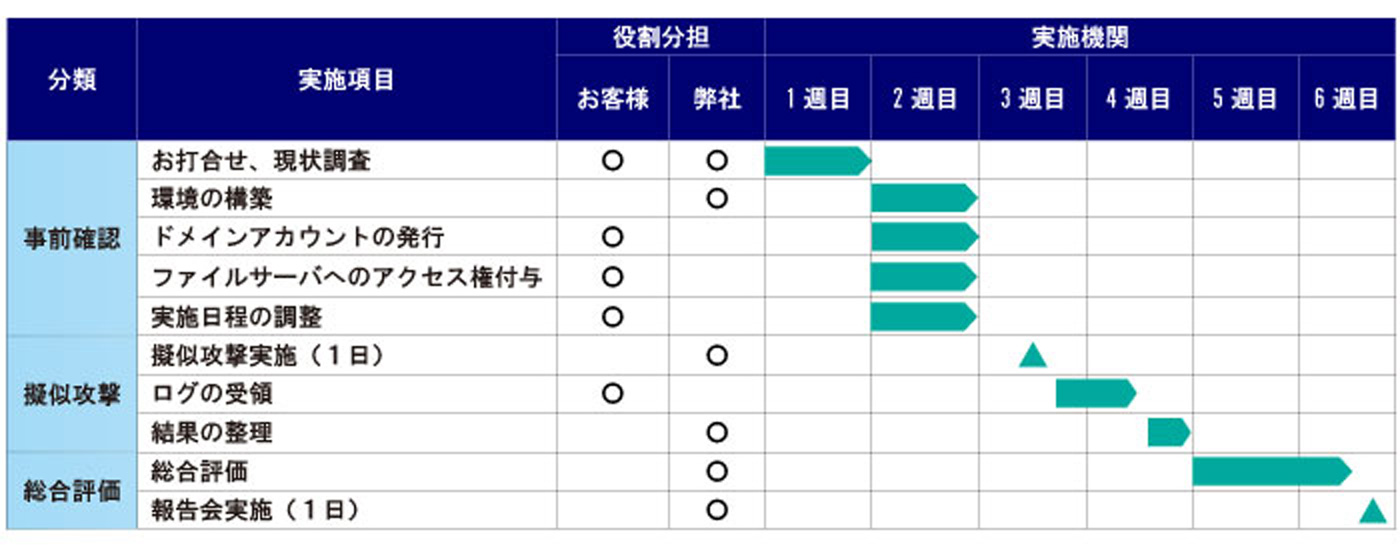 本サービスは、レッドチーム(※)が、お客さまネットワークのセキュリティ対策が標的型攻撃に対してどの程度対応(検出や遮断)できるのかを、評価するサービスです。疑似的なマルウェアや攻撃を用いて診断/評価し、改善策とともにご報告します。