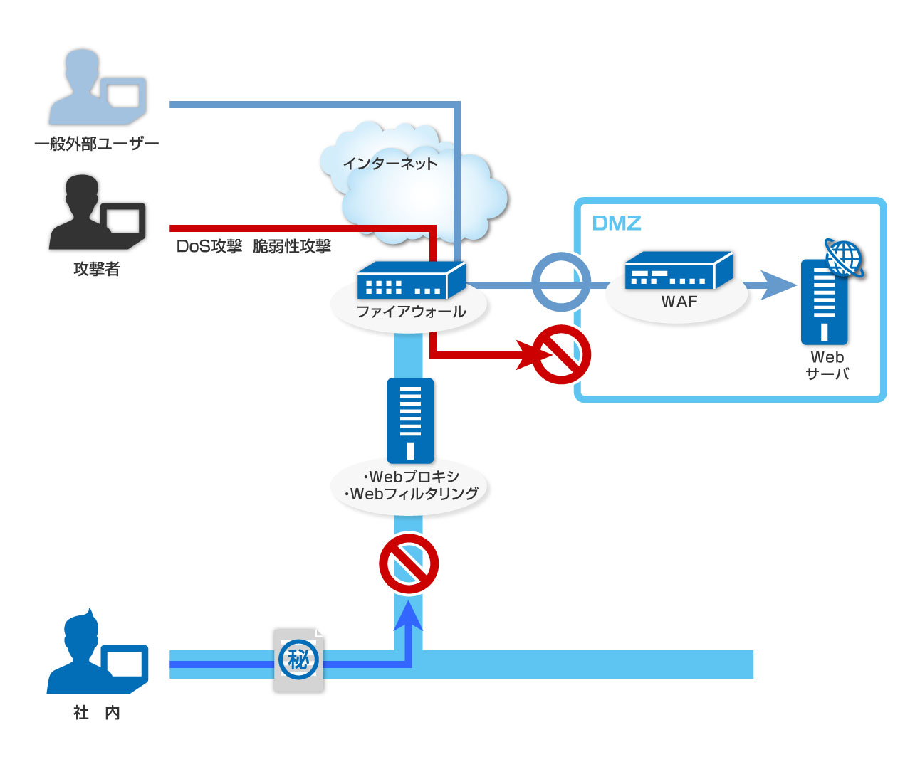 業務外のWebサイトへのアクセスを禁止することで、内部不正による情報漏洩やマルウェアサイトへの誘導を防止。また、Webサーバーへの不正アクセスなどサイバー攻撃からWebシステムを守る対策を実現します。