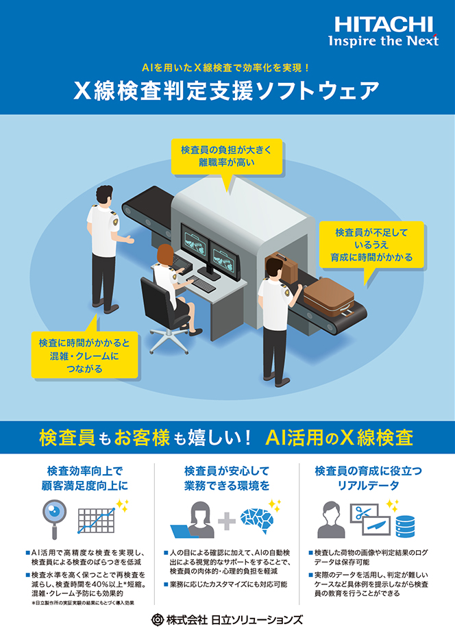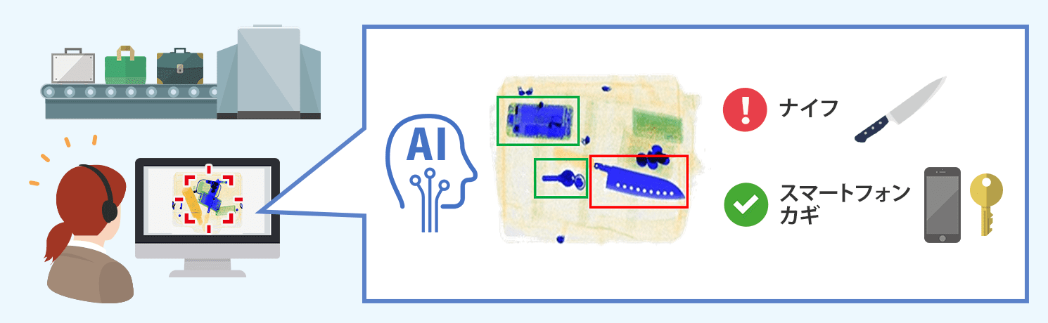 テロ対策など犯罪防止のため、大規模イベント会場やテーマパーク、空港など、さまざまな場所でX線装置を使った荷物検査が行われています。本ソリューションは、AIを活用した高精度な物品検出により検査員を支援し、業務の効率化・負荷軽減を実現します。