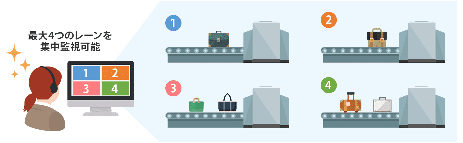 各レーンに設置した検査用PCをネットワーク接続することで、画面出力をひとつにまとめ、集中監視ができます。検査員の負荷が高く難しかった集中監視ですが、本製品により監視業務の負荷を軽減しながら各レーンへのアクションも可能となり、効率よく監視業務を行うことができます。