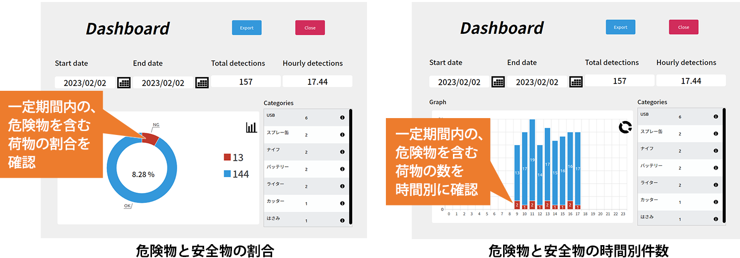 X線装置の稼働状況がダッシュボードに表示されます。時間別の荷物数、検知物品数などを可視化し、検査員へのフィードバック、適切な人員配置を行うことができます。