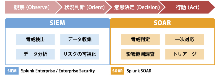 日立ソリューションズではSplunk社のSIEM製品「Splunk Enterprise / Enterprise Security」SOAR製品の「Splunk SOAR」を提供しています。「Splunk Enterprise / Enterprise Security」は脅威検知・データ収集・データ分析・リスクの可視化を担っており、脅威情報や分析結果を「Splunk SOAR」に連携します。Splunk SOARは、脅威情報や分析結果をもとに脅威判定・一次対処・影響範囲調査・トリアージを自動化します。この連携により、従来SOCやCSIRTで課題となっていたセキュリティ人材のスキルやリソース不足を解消し、セキュリティ運用の「高度化」、「効率化」、「迅速化」を実現します。