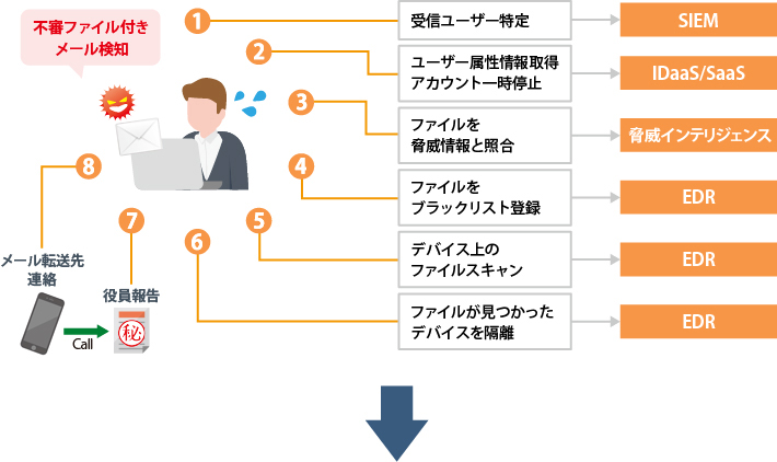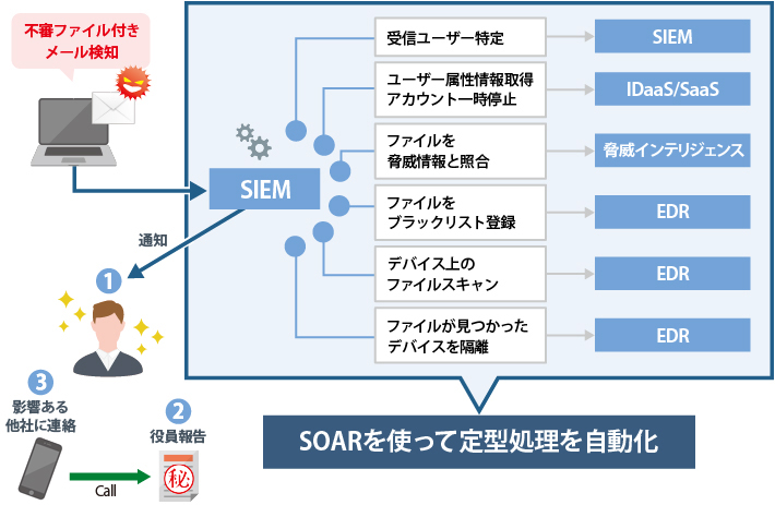 デバイスやクラウドサービスなどのログ管理やインシデント対応を自動化し、セキュリティ担当者の業務効率化と業務品質の均一化を実現します。