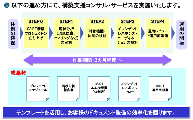 • 豊富な経験をもとに作成した独自のテンプレートを活用。効率的な構築・運用支援により、お客さまのCSIRTの早期立ち上げを実現します。