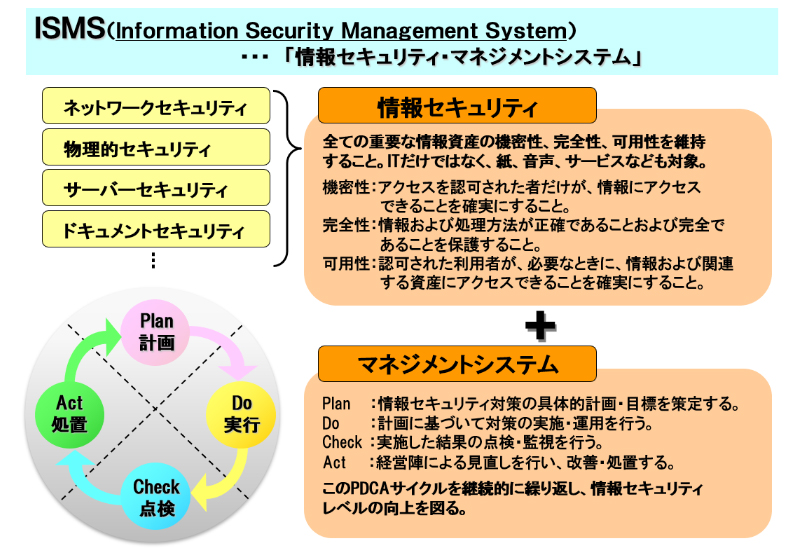 企業あるいは組織として、確実な情報セキュリティ運用を実現し、その運用状況を第三者が審査、承認するという制度がISO27001(ISMS)認証です。この認証の基となるシステムがISMS(Information Security Management System)です。