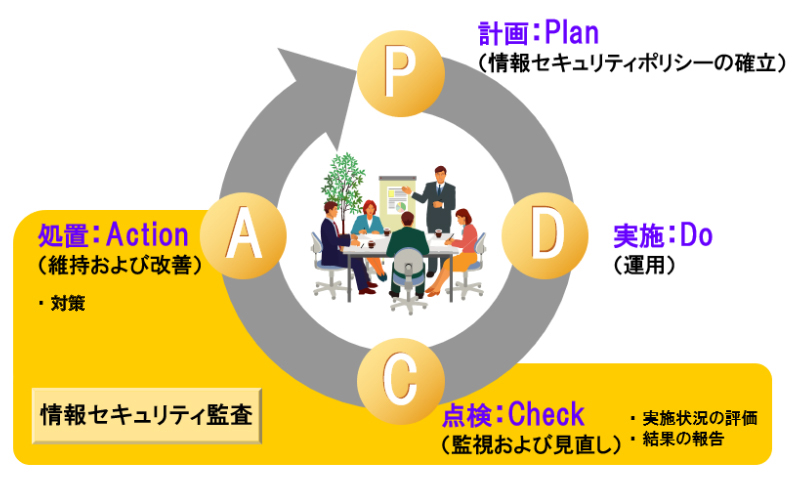 情報セキュリティ監査サービスは、PDCAによるセキュリティ運用におけるCheckおよびActionのプロセスにおいて、情報セキュリティが適切に対策できているか、また適切に運用されているかを確認します。