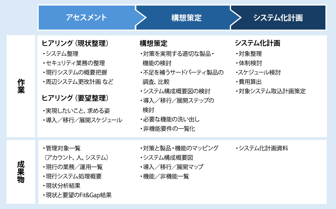 本コンサルティングでは、Microsoft 365のセキュリティ機能を中心として、当社がこれまでに培ったセキュリティ対策への知見を活用したアセスメントを実施し、お客さまのセキュリティ対策の現状と、強化すべき点を洗い出します。アセスメントの結果をもとに必要なセキュリティ強化策を提案、システム導入まで支援します。