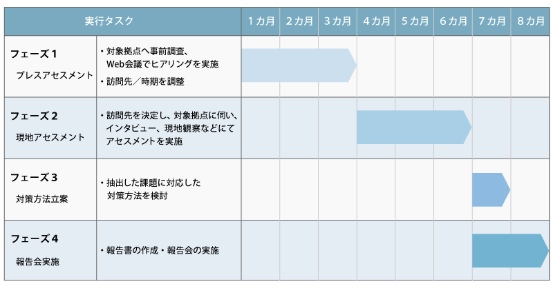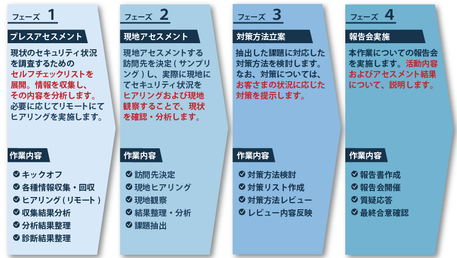 海外拠点の現地アセスメントを実施します。下記の4つのフェーズに分け段階的に作業を実施することで、課題を洗い出し、必要な対策まで確認可能です。また評価結果については報告書を作成し、報告会を実施します。