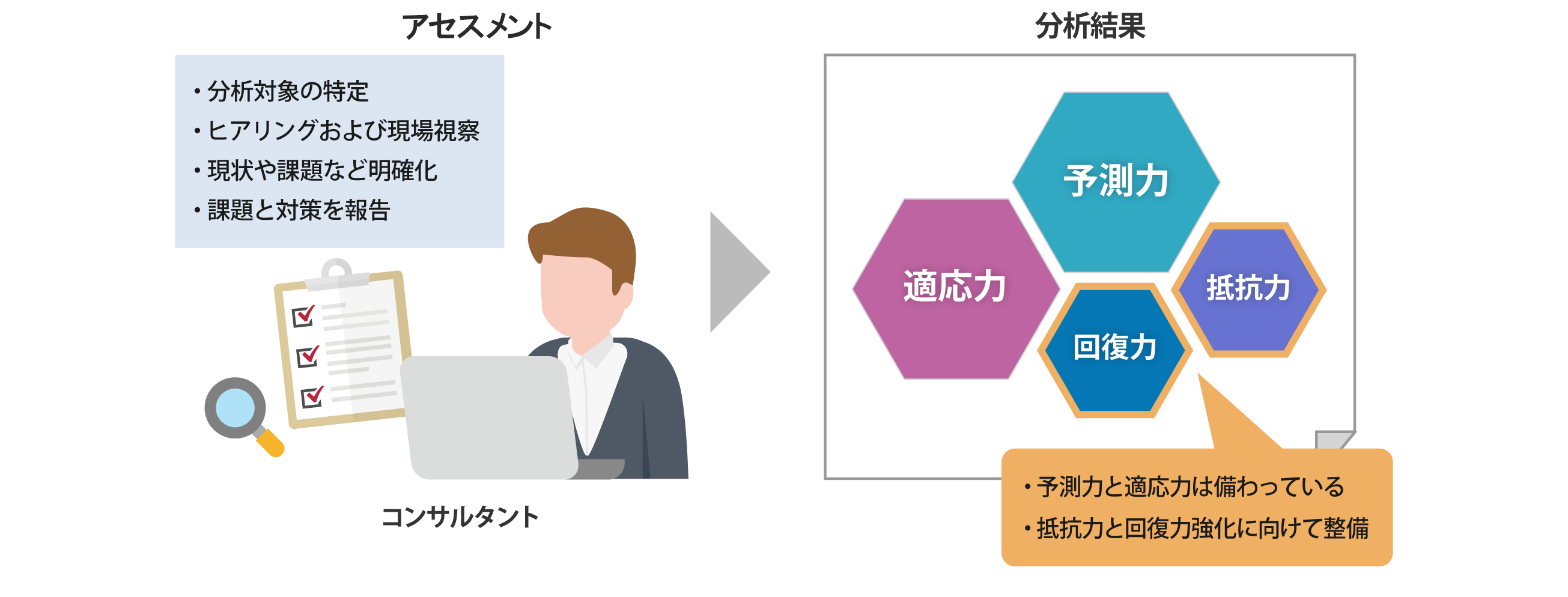 サイバーレジリエンスの状況について分析した結果を「アセスメント結果報告書」にてご報告します。