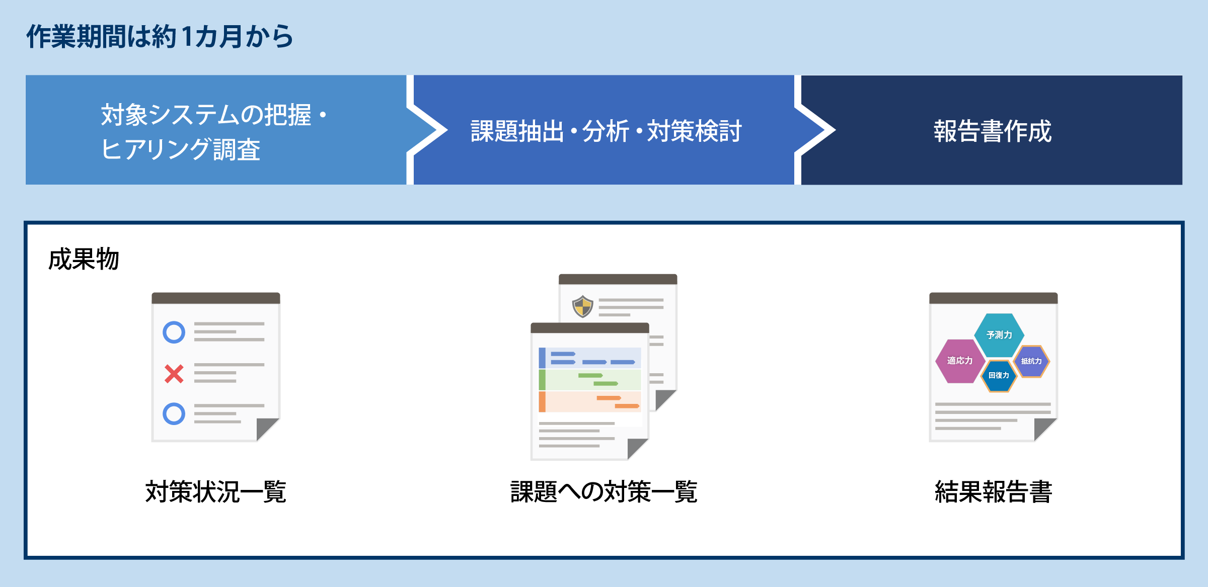 結果は報告書で提供。どうすればサイバーレジリエンスを強化できるのか、対策への道筋を明確にします。