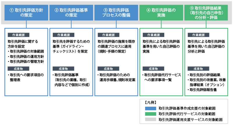 - 取引先評価方針の設定から、評価基準の作成、評価の実施、改善指導まで、トータルでサポートします。