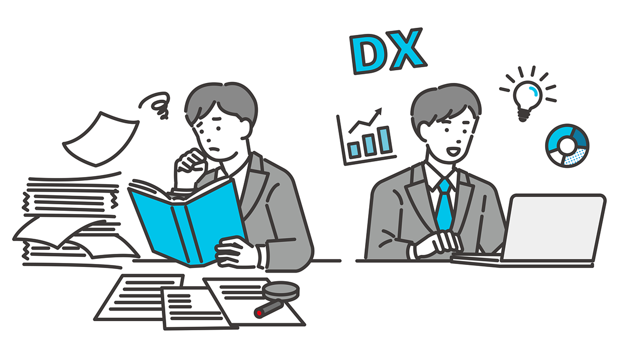 DXとは、端的にいえば、デジタル技術による業務の変革で企業に新たな価値や利益をもたらすことです。企業間の競争が激化する状況下で生き残るために、企業が提供する製品やサービスにおける品質の向上、新たな価値の創出、ビジネスモデルの変革などをめざします。また、デジタル技術を用いた業務プロセス改善もDXの重要なターゲットに位置づけられます。