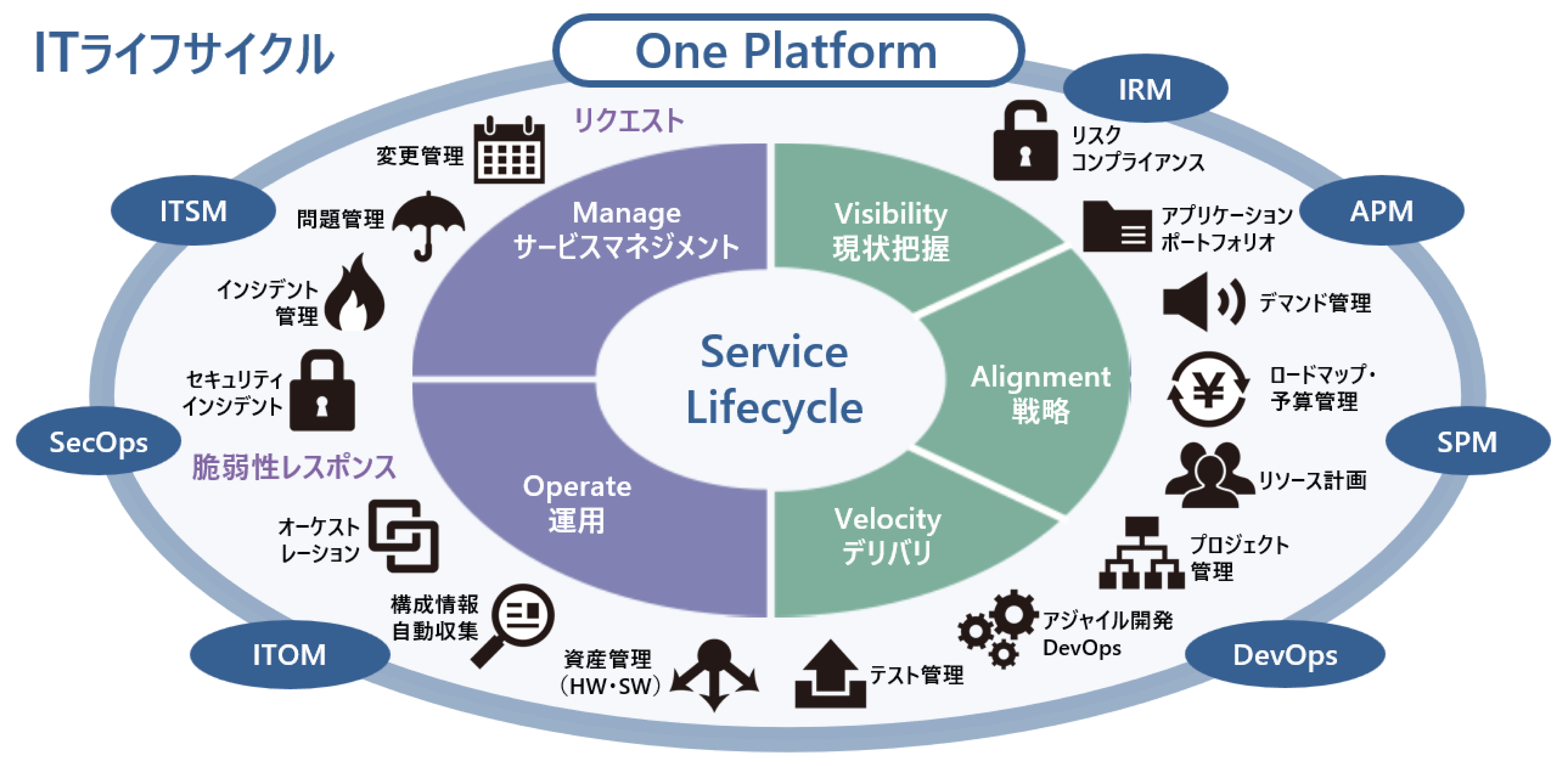 多くの企業が悩まされるIT運用管理の課題は、IT運用の一元化によって解決を図れます。「ServiceNowプラットフォーム」は、ITILに準拠し、IT運用管理のベストプラクティスを搭載したクラウド型プラットフォームです。社内のITライフサイクルにおいて必要とされるシステムを単一のプラットフォームで一元管理し、デジタルワークフロー、システム間連携によって、紙や手作業で行っていた業務プロセスをデジタル化することができます。