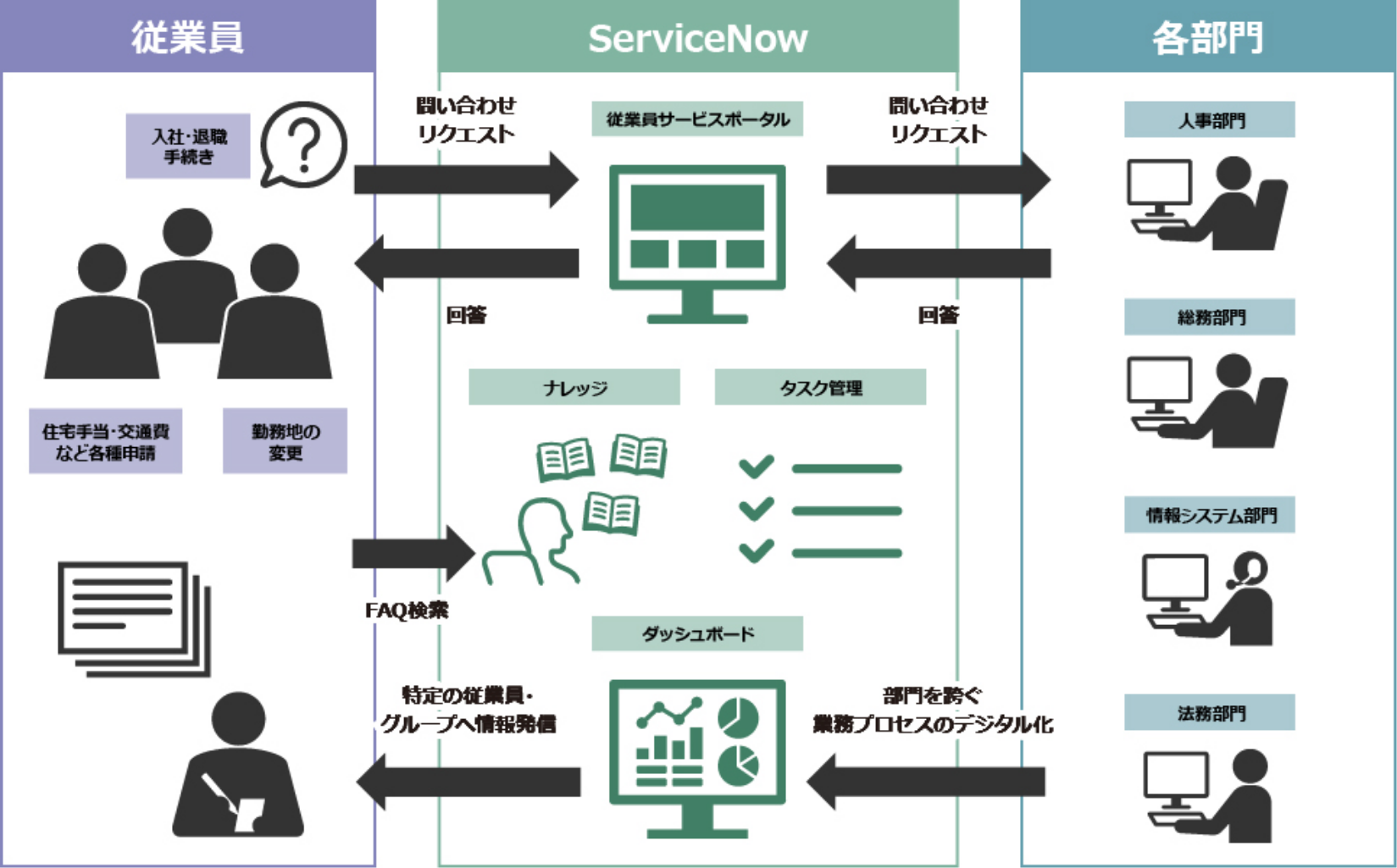 問い合わせやタスク管理、FAQなど従業員の求めるサービスを1つのポータルに集約することにより、従業員の生産性と満足度を向上します。